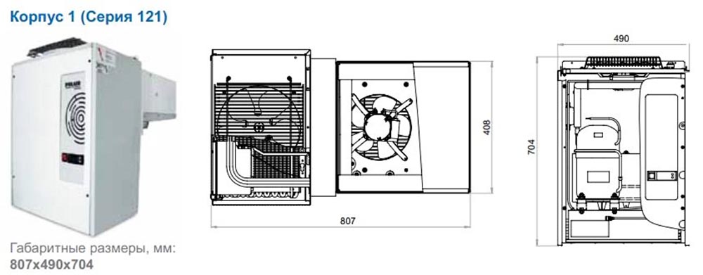 Холодильные машины состоят из двух основных блоков: испарительный блок, который размещается внутри холодильной камеры, и конденсаторный – снаружи камеры. В моноблоке наружный и внутренний блоки соединены в единую конструкцию теплоизоляционной прокладкой из пенополиуретана. Моноблоки устанавливаются в верхней части стены холодильной камеры.