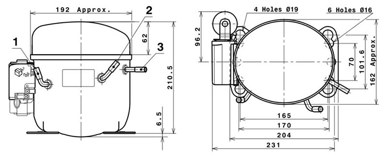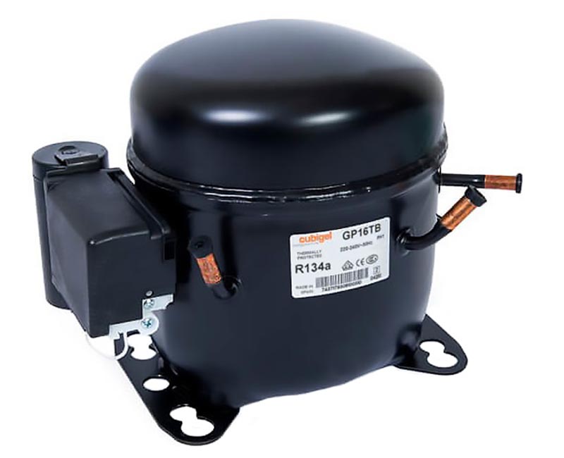 Герметичный поршневой холодильный компрессор Cubigel GP16TB, рабочий объем цилиндра 16,15 см3, высокотемпературное применение, требует принудительного внешнего охлаждения, для систем с капиллярной трубкой, холодопроизводительность составляет 1,204 кВт (при Ткип. = +5,Т конд.=+55),применяемый хладагент R134a.