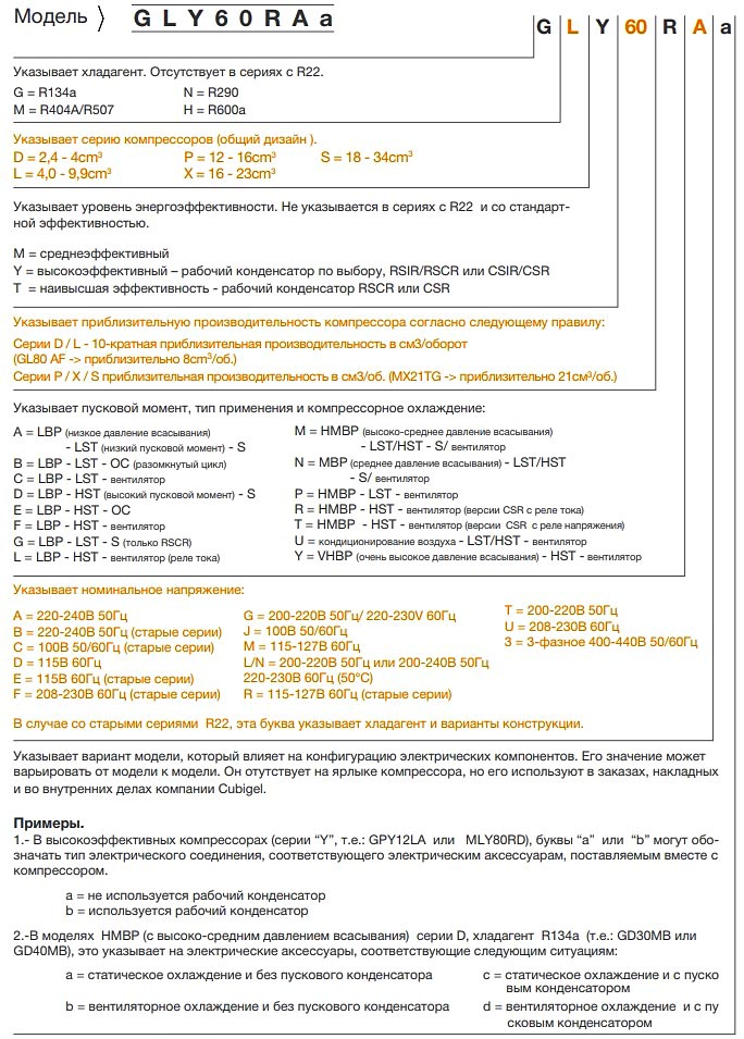 Обозначение моделей компрессоров Cubigel