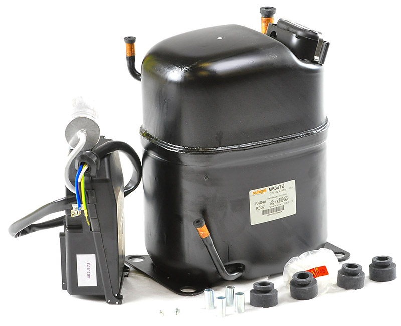 Герметичный поршневой холодильный компрессор Cubigel MS34ТB, рабочий объём цилиндра 34,42 см3, высокотемпературное применение, требует принудительного внешнего охлаждения, холодопроизводительность составляет 4,7 кВт (При Ткип. = +5, Т конд.=+50),применяемый хладагент R404A.