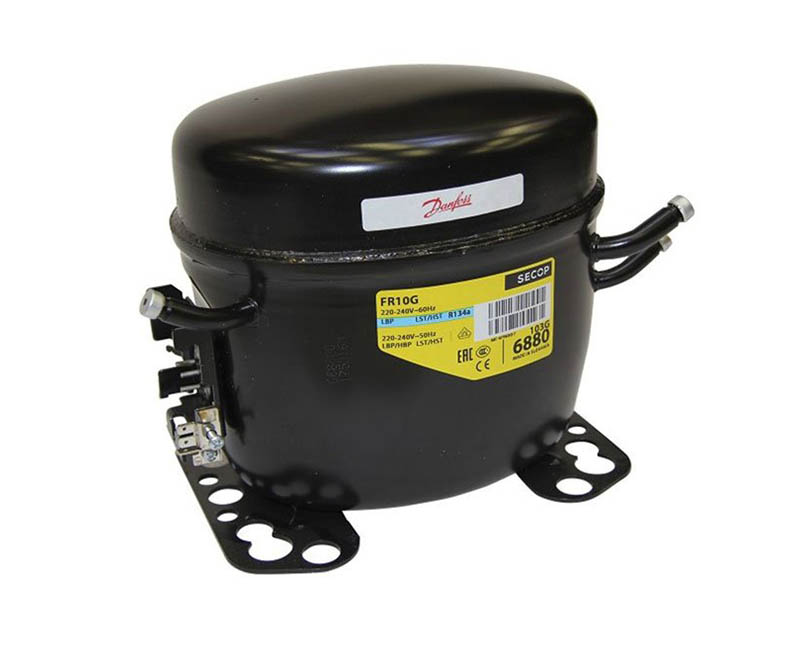 Герметичный холодильный компрессор Secop FR10G. Задача холодильного компрессора в холодильном агрегате заключается в отсасывании паров хладагента из испарителя холодильного агрегата, сжатия, и подачи их под давлением в конденсатор холодильной парокомпрессионной машины. Холодопроизводительность составляет 0,188 кВт (EN 12900, -20/+55, R134a).