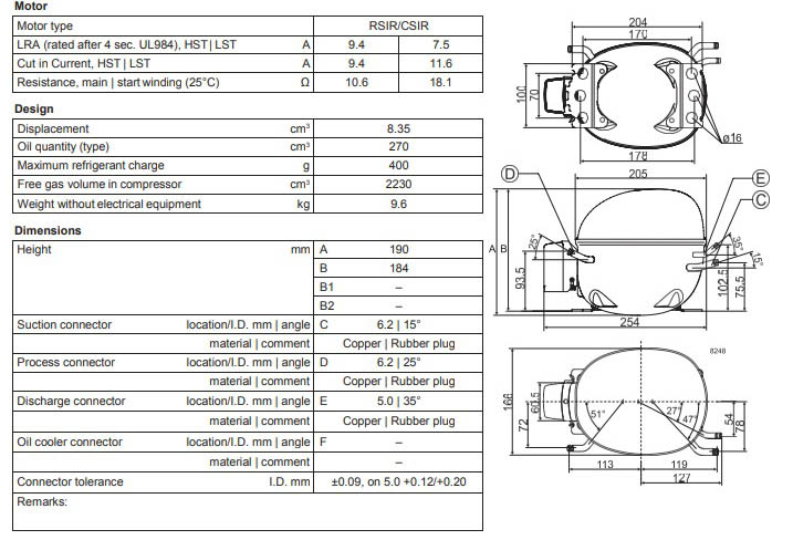 Обмотка двигателя защищена изоляционной эмалью из синтетических смол от пробоев при возникновении теплового удара. Высокие расчетные пределы нагрузок обеспечивают надежную эксплуатацию компрессора длительное время. Пусковое реле: ZA6H, сопротивление обмотки пусковой [Ом]: 13,00 Ohm, сопротивление обмотки рабочей [Ом]: 14,80 Ohm.
