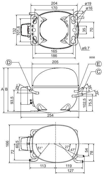 Герметичный холодильный компрессор Secop (Danfoss) NF6.1MLX. Задача холодильного компрессора в холодильном агрегате заключается в отсасывании паров хладагента из испарителя холодильного агрегата, сжатия, и подачи их под давлением в конденсатор холодильной парокомпрессионной машины. Холодопроизводительность составляет 0,488 кВт (EN 12900, -10/+45, R404a/R507).