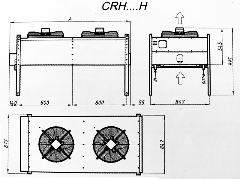 Конденсатор воздушного охлаждения Garcia Camara серии CRH. Теплообменная поверхность выполнена из медной трубки и алюминиевых ребер с шагом 2,1 мм. Корпус конденсатора изготовлен из оцинкованного стального листа и окрашен в серый цвет. В комплекте имеются опоры для установки. Напряжение вентиляторов 380В/50Гц.