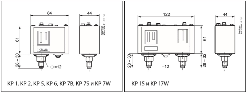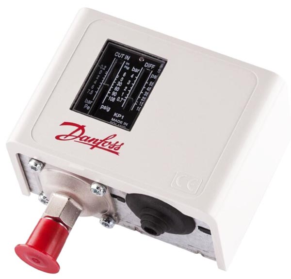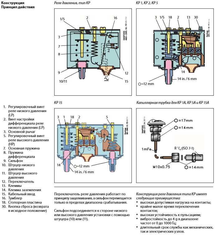 Реле давления типа КР Danfoss предназначены для использования в холодильном оборудовании с целью защиты системы от слишком низкого давления всасывания или слишком высокого давления нагнетания. Реле давления КР используются также для пуска и остановки компрессоров холодильных установок и вентиляторов конденсаторов, охлаждаемых воздухом. Усиленная контактная группа, рассчитанная на нагрузку 16 А, дает им возможность управлять работой электродвигателей мощностью до 2 кВт без применения контакторов. Макс. испытательное давление = 20 бар; Контактная нагрузка, AC: AC1: 16 А, 400 В; AC3: 16 А, 400 В; AC15: 10А, 400 В. Макс. пусковой ток (LR): 112А, 400 В. Контактная нагрузка, DC: DC13: 12 Вт, 220 В ток управления.