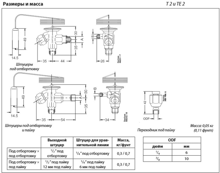 ТРВ Danfoss, размер входного штуцера 3/8 дюйма, длина капиллярной трубки 1,5 м, макс. рабочее давление 34,0 бар. Поставляется без клапанных узлов.