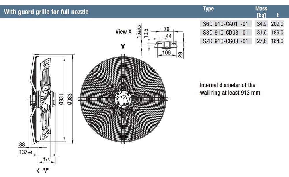 Вентилятор Ebmpapst S6D910-CA01-01 расшифровывается: S-осевой вентилятор с защитной решеткой, 6-количество полюсов электродвигателя, D- трехфазный двигатель, 910-диаметр крыльчатки, CA-расшифровка механической конструкции, 01-расшифровка электрической части, 01-расшифровка модификации мех. конструкции. Угол закрутки лопастей 0*. Варианты подключения Y/D, направление вращения “V”(всос со стороны ротора.)