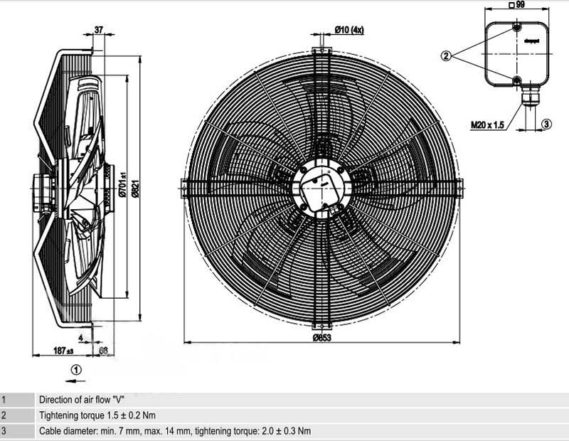 Вентилятор Ebmpapst S6D710-AH01-01 расшифровывается: S-осевой вентилятор с защитной решеткой, 6-количество полюсов электродвигателя, D-трехфазный двигатель, 710-диаметр крыльчатки, AH-расшифровка механической конструкции, 01-расшифровка электрической части, 01-расшифровка модификации мех. конструкции. Угол закрутки лопастей 5*. Варианты подключения Y/D, направление вращения “V”(всас со стороны ротора.)