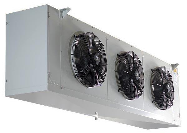 Кубический воздухоохладитель LU-VE F62HC2312E7, холодопроизводительность при условиях Tc=-8°C, DT1=8K, R404A составляет 59,6 кВт. Корпус выполнен из оцинкованной стали с нержавеющим напылением Epoxy-Polyester,имеет сертификат “Евровент”. Шаг оребрения 7.5 мм. В воздухоохладителе LU-VE F62HC2312E7 применяется высокоэффективный теплообменник Turbocoil, высокая эффективность теплообмена в котором, достигается за счет применения медных труб малого диаметра, с внутренней винтовой насечкой, и пластин оребрения, из листового алюминия с турбулизаторами специального профиля, уменьшающих степень усушки и намораживания. Три вентилятора с диаметром колеса 630 мм.